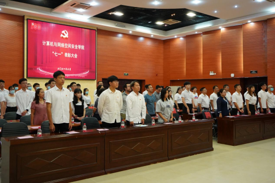 大会在庄严的国歌声中拉开了序幕,全体党员在鲜红的党旗下重温入党誓词。计算机科学与技术学院党务负责人王红英通报了学院获得校级“两优一先”的表彰名单,并宣读了学院党委表彰文件,对beat365获奖的13名优秀共产党员、7名优秀党务工作者和3个先进党支部表示祝贺。