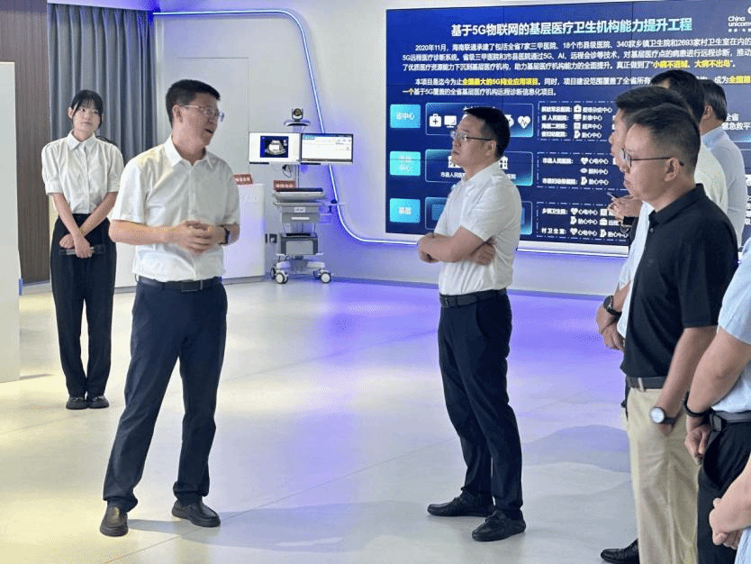 中国联通海南省分公司党委书记、总经理谢华(左二)陪同刘谦副校长(左三)参观海南联通科技馆