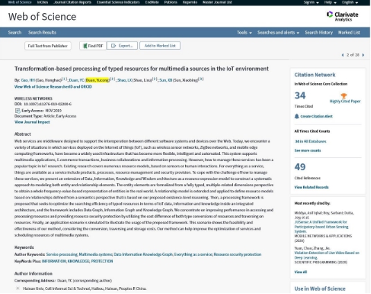 该论文于2019年11月在计算机、信息系统工程领域国际权威期刊WIRELESS NETWORKS(JCR二区)发表,据科睿唯安(Clarivate Analytics)公布的ESI高被引论文(Highly Cited Paper)数据,该论文至今累计被引49次,入选为由Web of Science识别的该学术领域前1%的高被引学术论文。该论文开展了针对物联网环境下多媒体的基于转化的DIKW(数据、信息、知识与智慧)类型资源处理研究。该成果对人工智能、物联网、信息融合以及智慧服务等相关领域研究具有显著推动作用。
