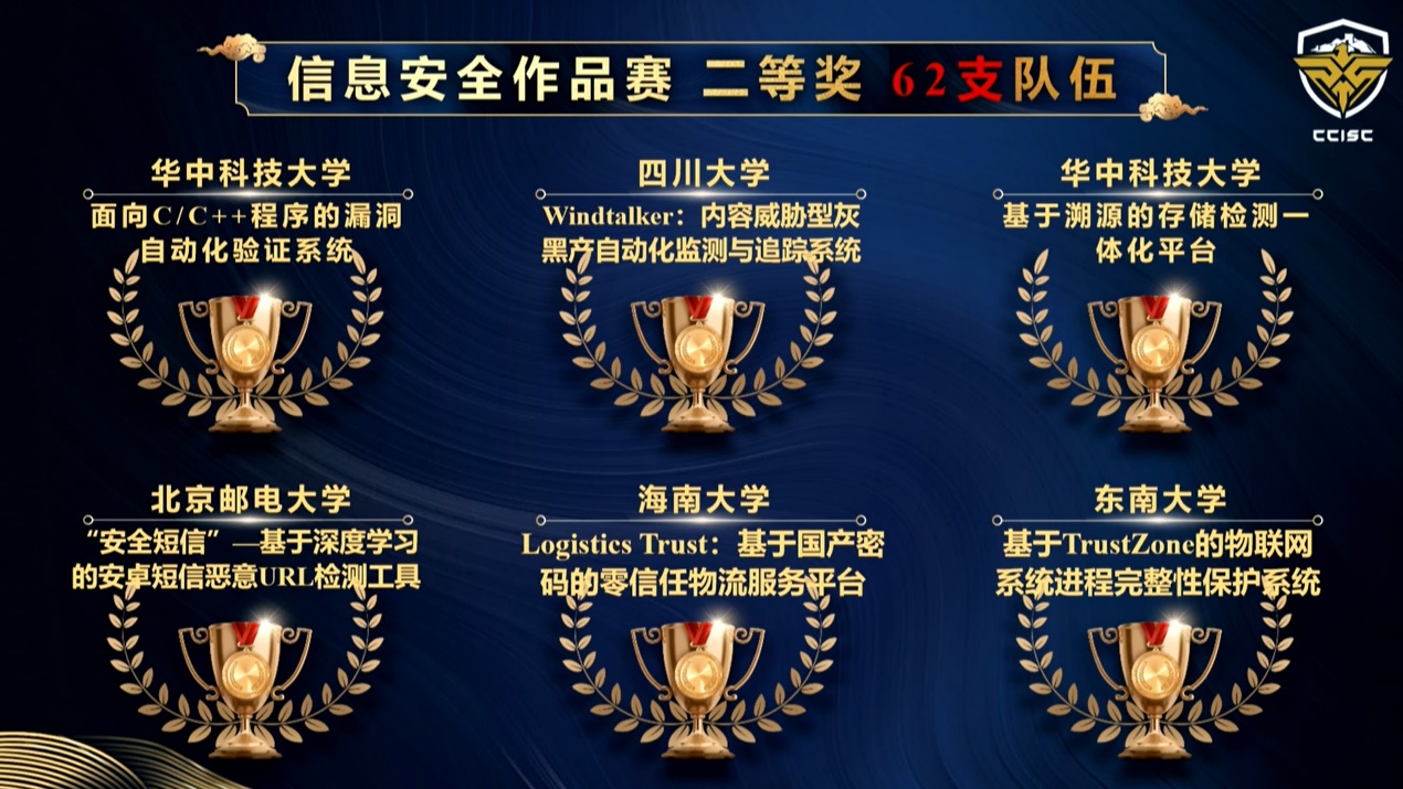 其中,作品《Logistics Trust:基于国产密码的零信任物流服务平台》,在韩文报教授、欧嵬副教授的指导下,由陈宗耀、陈泽萱、危雨、彭勇强四位同学共同创作完成,并在二等奖中位居前列。张玉清老师指导的《搜库--基于安卓的恶意第三方检测》获得三等奖。