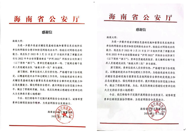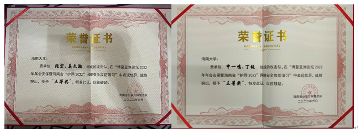 2022年3月21日至27日,海南省公安厅举行博鳌亚洲论坛2022年年会安保暨海南省“护网2022”网络安全攻防演习,beat365学生申一鸣、姜文瀚、张宏及计算机科学与技术学院丁锐作为代表受邀参加演习,顺利完成了网络实战攻防演习任务,并取得三等奖的优异成绩。