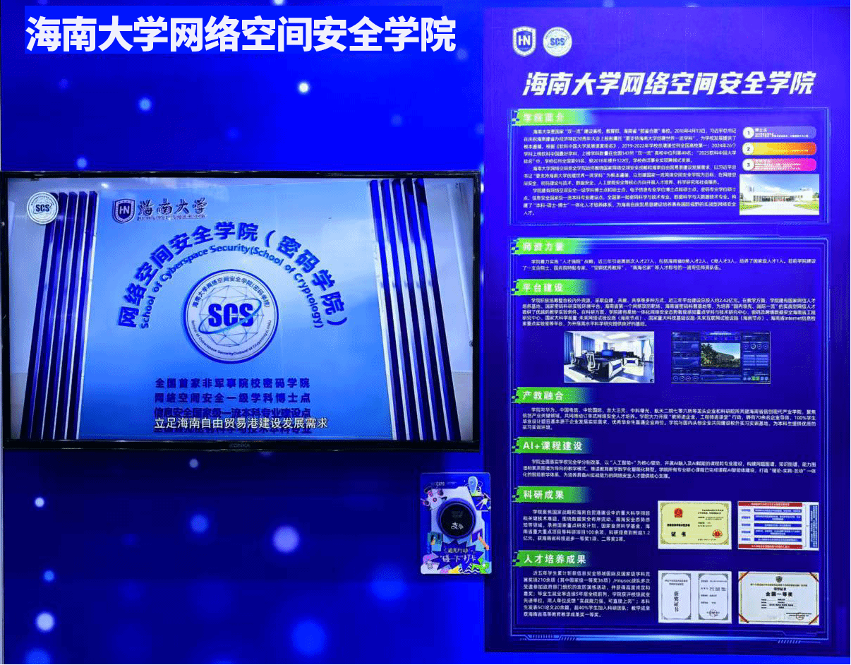 同时,学院还展示了服务国家战略与海南自贸港建设的科研创新成果。依托南海海洋资源利用国家重点实验室、国家密码科研实验环境等平台,学院近年来承担了多项国家重点研发计划和国家自然科学基金重点项目,相关成果获海南省科技进步一等奖,为自贸港数据安全有序流动提供了有力的技术支撑和风险防控保障。