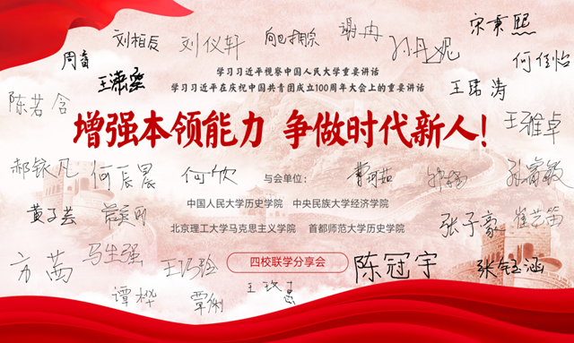 5月13日下午,为深入学习习近平总书记4月25日视察中国人民大学的重要讲话精神,感悟新时代青年如何响应时代发展呼唤、在青春的赛道上跑出最好成绩,jinnian金年会联合中国人民大学历史学院、中央民族大学经济学院、首都师范大学历史学院在线上举办主题为“增强本领能力,争做时代新人”联学共建活动。