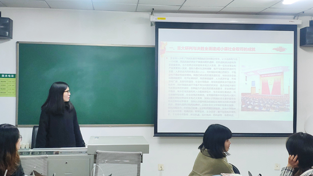 会议伊始,凡萌玮同学为大家梳理十九届五中全会公报的大致内容,主要从重大研判与决胜全面建成小康社会取得的成就、二〇三五年基本实现社会主义现代化远景目标、“十四五”时期经济社会发展指导思想和必须遵循的原则、“十四五”时期经济社会发展主要目标和实现“十四五”奋斗目标的举措这五个方面进行讲解,让同学们在了解党中央重大决策部署的同时,也对十九届五中全会的会议精神有了深刻的理解。
