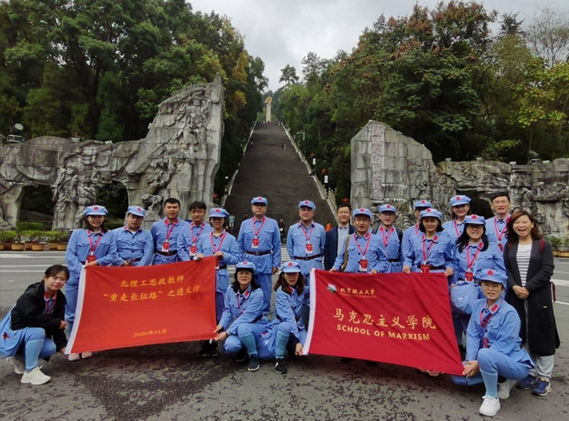 “本次‘重走长征路’遵义行,走入实地、身处实景、触摸实物,沉浸体验观旧址、听讲述、忆先烈,精神洗礼、灵魂淬炼,感怀革命事业艰辛不易,为我们讲好思政课提供了鲜活素材,也接受了一次深刻教育。”参加完“重走长征路”活动的老师们这样说。2020年11月5日-11月8日,jinnian金年会22名思政教师开展了“重走长征路”的第二站活动,本站为中央红军长征走向伟大胜利的转折地--贵州遵义。本次活动以“重走长征路”为主线,缅怀革命先烈,观红色旧址,唱红色歌曲,感受红色精神,传承红色文化为主要内容,让教师们真正的亲身体会长征精神。“重走长征路”活动是北理工jinnianhui金年会诚信至上针对思政教师社会实践不足问题进行设计的系列活动。按照长征路线,系统设计了突围、转折、出奇、团结、挑战卓绝、曙光、会师之旅八个模块,分期分批组织教师开展现场体验,编写教学案例,为思政课教师在课堂“把理说透”,大力提升思政课抬头率、点头率奠定扎实的理论和实践基础,同时也希望思政教师通过此活动,能拧成一股绳,以长征精神相互勉励,为学校的发展以及“双一流”建设贡献自己的力量。