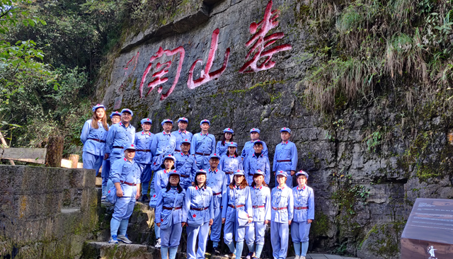 全体教师追寻习近平总书记的“红色足迹”,赴贵州省遵义市凤凰山的红军山烈士陵园进行了现场学习调研,这也是本次行程的第一站。瞻仰邓萍同志之墓,聆听年仅27岁在长征中牺牲职务最高的红军将领红三军团参谋长邓萍同志的故事,让我们铭记他为遵义战役的胜利做出的贡献。瞻仰红军英烈墙,深刻感受到革命先辈们坚忍不拔的信念,英雄可以无名,但不可以让他们无声!石碑无声,但英烈们的精神却是永放光芒的。拜谒红军坟,聆听了红军卫生员龙思泉与当地居民的感人肺腑故事,浓浓的鱼水之情,让我们牢记“全心全意为人民服务”宗旨。在女红军战士王泉媛的铜像旁,讲解老师饱含泪水深情地讲解了女红军坎坷的一生,坚忍不拔而光明面对人生,九死一生凸显巾帼不让须眉的豪情壮志。在烈士纪念碑前,感悟遵义会议精神,追溯“强渡乌江”、“遵义人民迎红军”、“娄山关大捷”和“四渡赤水”的历史。在红军烈士纪念碑前的广场,教师们敬献花篮、集体向革命烈士鞠躬致敬、集体重温入党誓词,以表达我们对在革命斗争中牺牲的无数红军烈士的崇高敬意。