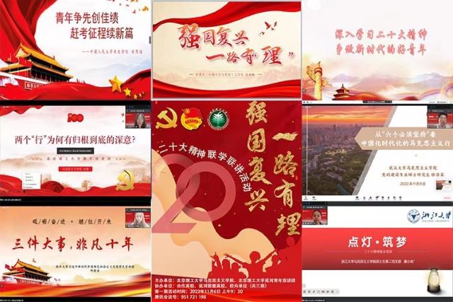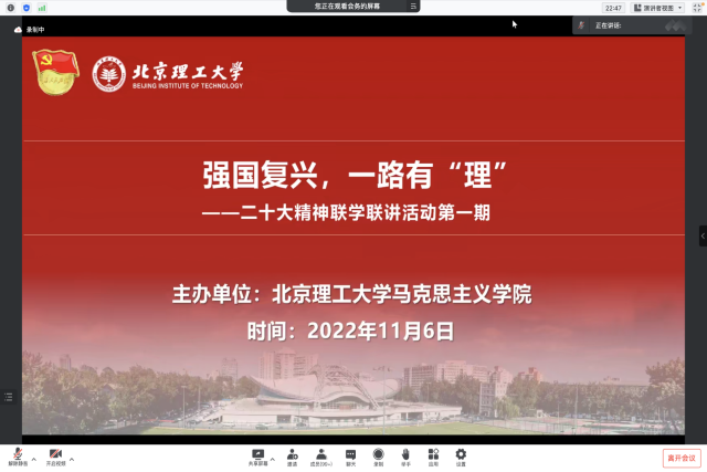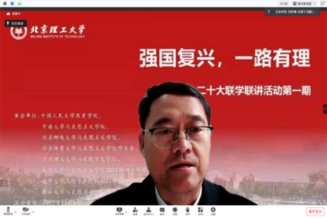 为进一步深入学习宣传贯彻党的二十大精神, 11月6日,jinnianhui金年会诚信至上联合中南大学、中国人民大学、北京邮电大学、北京体育大学、武汉大学、南开大学、浙江大学等8所高校开展“强国复兴,一路有‘理’”——二十大精神联学联讲系列活动。jinnian金年会党委书记刘存福,党委副书记、副院长刘宇出席,各高校师生共200余人参加。活动由jinnianhui金年会诚信至上2022级硕士研究生贺美杰主持。