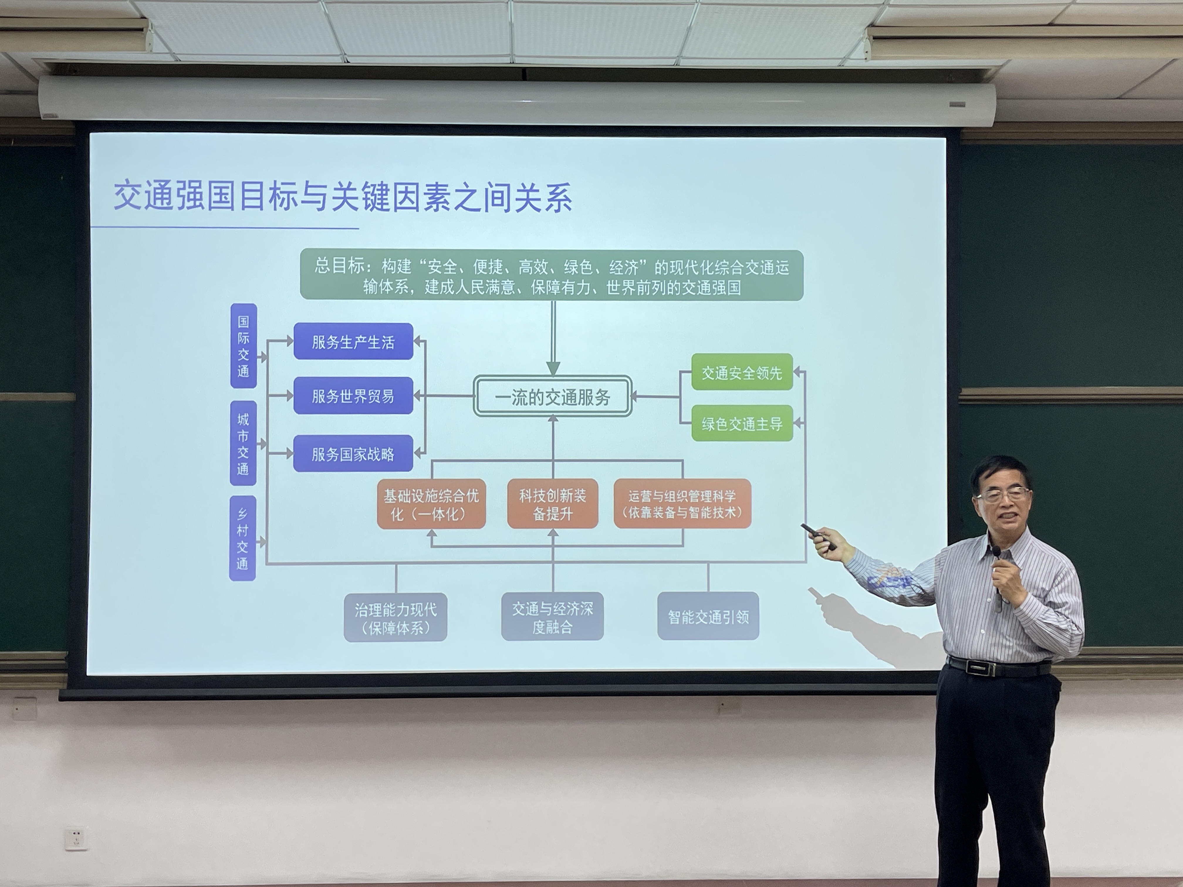 陆化普紧扣主题,针对交通强国建设目标、走中国特色的交通强国之路、交通强国建设的关键突破点、国家综合立体交通网规模结构及特点以及人才需求特点五个方面进行了讲授。他就现代化综合交通运输体系的五个特征作了详实的讲解,指出实现交通强国总目标的三大关键因素及其相互关系。接着,陆化普以人口密度为切入点,阐释了必须走中国特色的交通强国之路是由中国国情特点决定的,建设交通强国既要有全球视角又要从实际出发。他还巧用实例,通过不同地域的交通状况和日常生活中的出行问题,深入浅出地阐明交通基础设施综合优化的重要性。此外,陆化普倾心传授了有关治学和科研的经验心得,呼吁大家勤学钻研,将自身所学与国家所需紧密结合。他强调,新时代人才必须具备创新能力,当代大学生应当勤于观察、善于思考,主动探究事物机理和规律,寻求其影响因素与影响模式,结合所学理论知识为现实问题提出解决方案,以破解社会难题,为国家和时代做出力所能及的贡献。