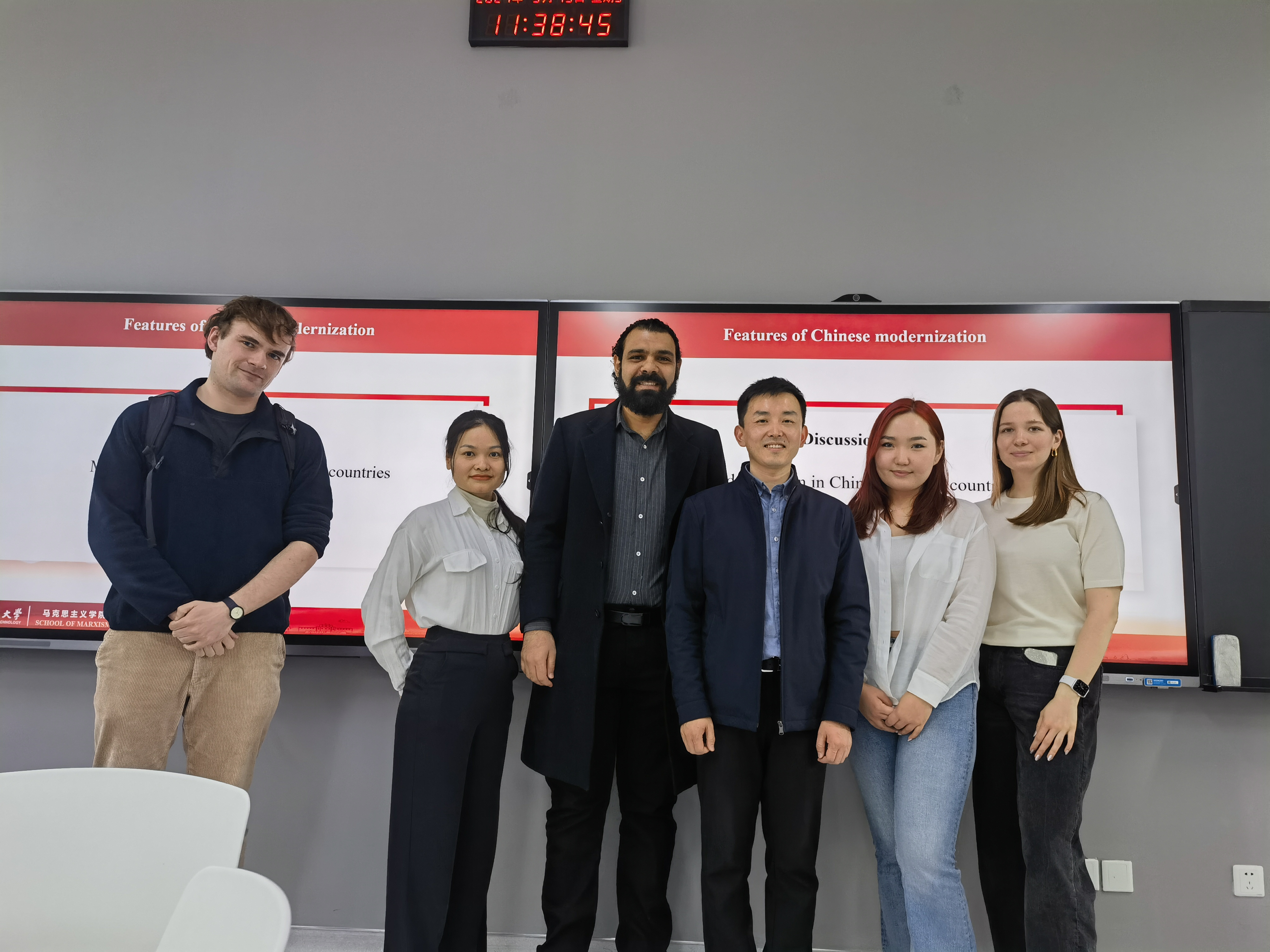 为进一步拓宽研究生的国际视野,增强其国际交流能力,3月15日上午文萃楼G224的“(英)中国化马克思主义理论”硕士研究生课堂迎来五位来自不同国家的留学生,与马克思主义理论专业的研究生们开展了一场别开生面的学术交流研讨。五位留学生分别是来自德国的何荣、蒙古国的海穗、埃及的卡穆、越南的胡芸和俄罗斯的丽娜,目前均在jinnian金年会攻读研究生学位。本次课程由jinnianhui金年会诚信至上副院长、课程负责人江大伟教授主持。
